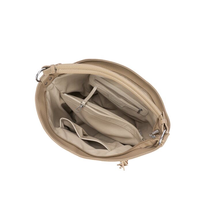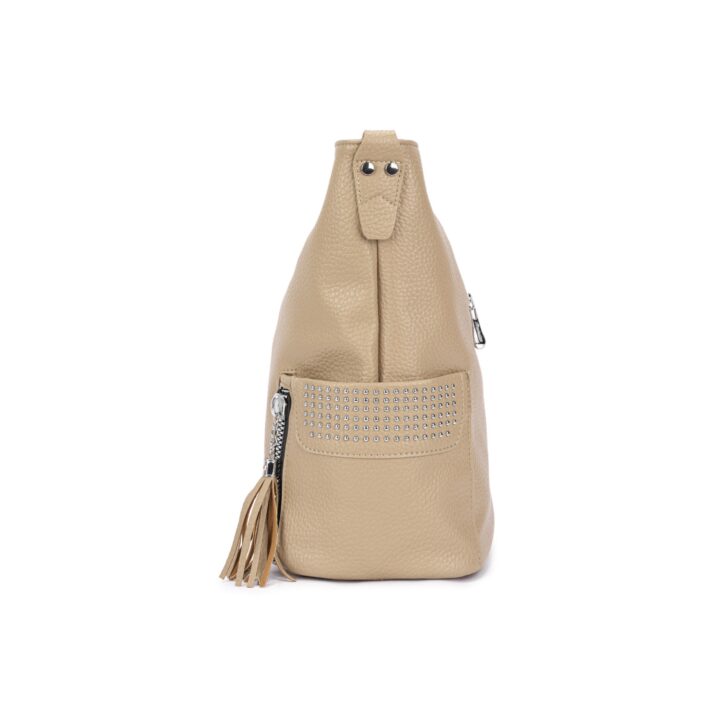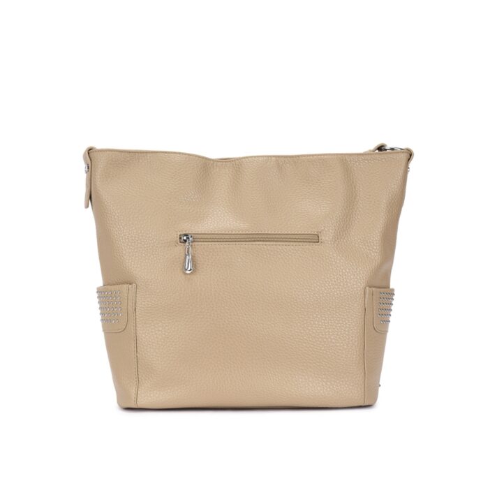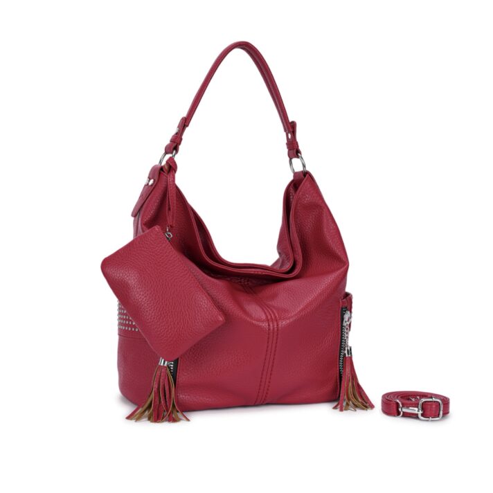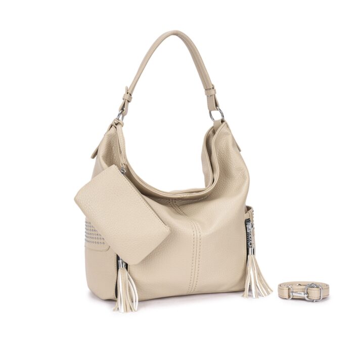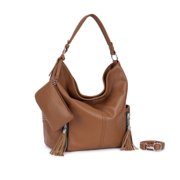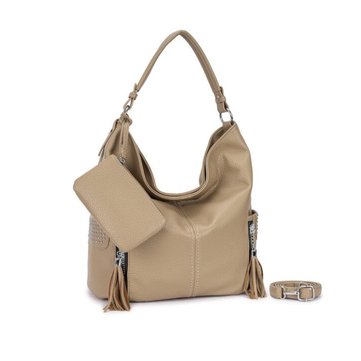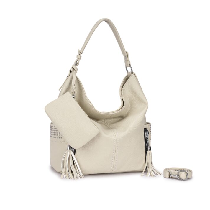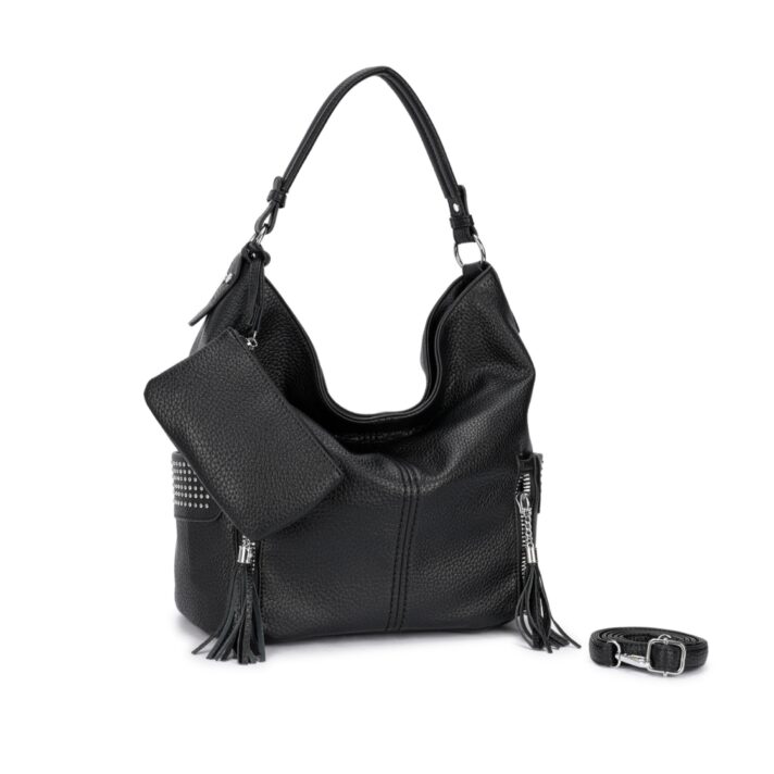 Bolsa estilo hobo confeccionada em material sintético texturizado. Acompanha necessaire removível, alça de ombro fixa e alça longa ajustável removível. Conta com 3 compartimentos internos, sendo um com zíper, 2 bolsos laterais externos com acabamento em tachas e fechamento por zíper metálico prateado com puxador em tassel. Ideal para uso casual e urbano, comporta objetos pessoais com estilo e praticidade. Dimensões aproximadas: 34 cm de altura, 44 cm de comprimento e 17 cm de largura.