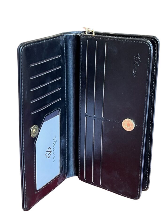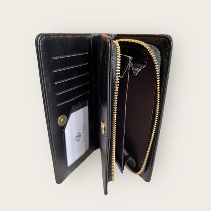 – **Divisões**: A carteira possui três divisões principais, sendo uma com zíper, ideal para armazenar moedas e itens menores, proporcionando segurança extra.